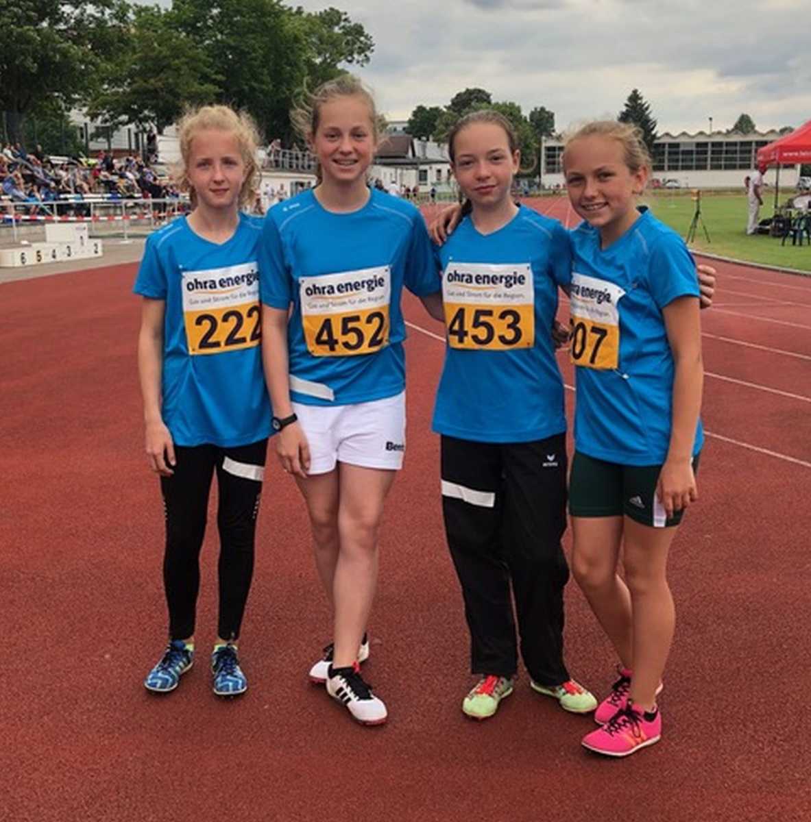 Die Mädchen der U14 Startgemeinschaftsstaffel über 4 x 75m mit Nelly Keppler, Johanna Stoy ( beide LAV Bad Köstritz Elstertal ), sowie Gloria Eibert und Sandrine Hilke ( 1. SV Gera ) überraschten wahrscheinlich nicht nur Betreuer sondern auch die Konkurrenz.