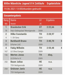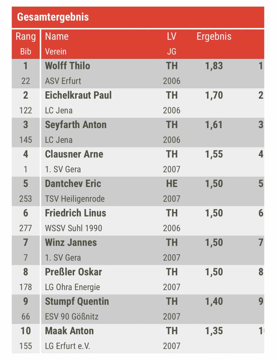 Endlich, endlich war es soweit und in Thüringen fand am 19.06.21 ein Leichtathletik- Wettkampf für (fast) alle statt.Von der U14 bis zum Seniorenalter durfte jeder starten, unabhängig von Kaderstatus oder Vorleistungen. Von unserem Verein gab es auch zahlreiche Teilnahmebekundungen, allerdings waren kurzfristig krankheitsbedingte Ausfälle zu verzeichnen, so dass letztendlich noch ein Quartett übrig blieb. Die vier haben sich ganz gut präsentiert und konnten jeder für sich mit Bestleistungen glänzen. So schafften Jannes Winz und Arne Clausner in der M14 die Hochsprunghöhen von 1,50m bzw. 1,55m.