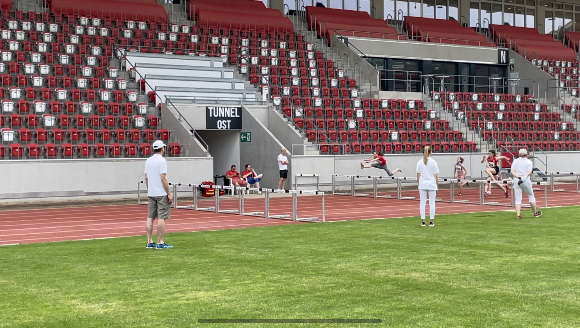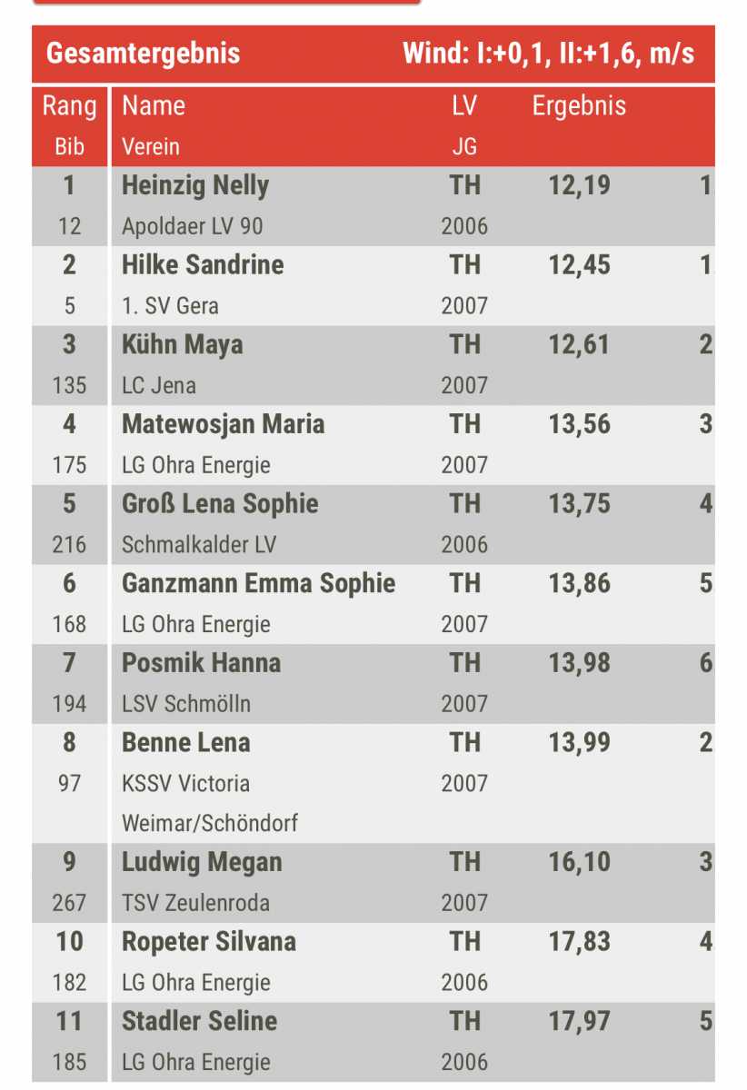 Seine Schwester Sandrine Hilke, als einzige junge Dame vom 1.SV Gera am Start, verbesserte sich stark über 80m Hürden- 12,45s, sowie über 100m - 13,34s.Letztendlich probierte sie noch die 300m flach aus und lieferte mit 43,11s eine ziemlich ordentliche Zeit ab.