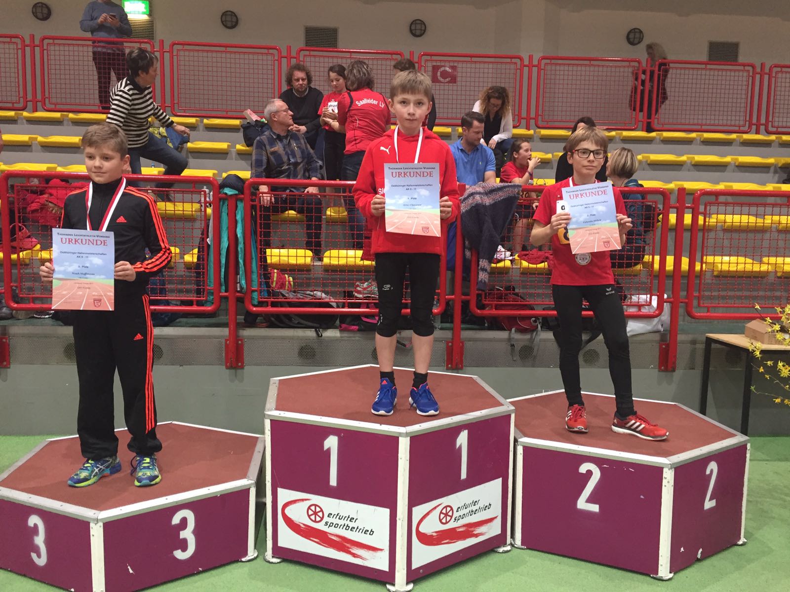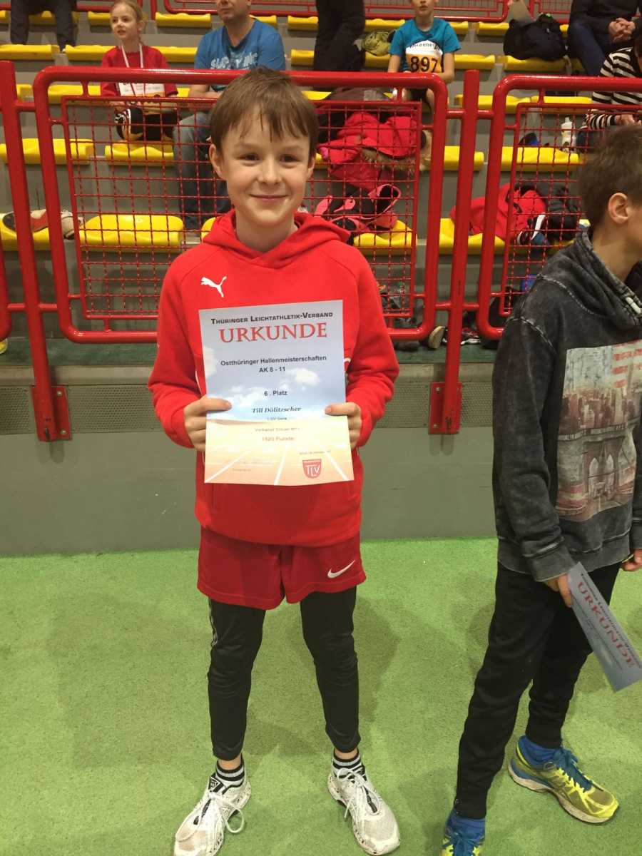 Am 18.02. fanden in Erfurt die Osttüringer Meisterschaften für die Altersklassen U10 und U12 statt. In der M8 gewann Constantin Hilke seinen 800m-Lauf (3:12min). Insgesamt landete er im Vierkampf auf dem vierten Platz. Seine Schwester Sandrine (W10) zeigte über die 50m (8,47s), im Weitsprung (3,42m) und im 800m-Lauf (3:04min) solide Leistungen. Durch einen schwachen Hürdenlauf verpasste sie den Anschluss an die Spitze und wurde 13. In der M10 legte Arne Clausner einen starken Mehrkampf hin. Die Bestleistungen im Sprint (7,79s) und im Weitsprung (4,21m) waren die Grundlage für den Gesamtsieg in seiner Altersklasse. In der M11 war die Konkurrenz für Till Dölitzscher, Yannick Hüttner und Florian Voigt ziemlich stark. Till und Yannik konnten sich im Hürdenlauf deutlich verbessern (10,65s und 11,92s). Till sprang zudem erstmals im Weitsprung über vier Meter. Er schaffte mit diesen Leistungen als Einziger den Sprung unter die besten Sechs. Florian und Yannick belegten die Plätze 15 und 16.