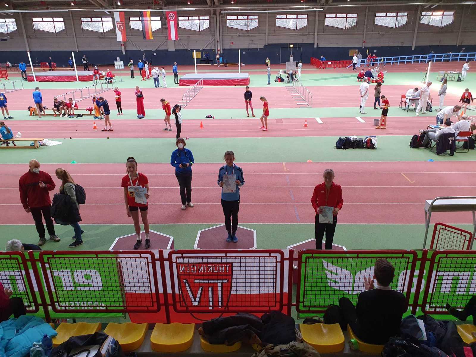 Anna Heller räumte in der W14 richtig ab. Sie kam mit 3 Bronzemedaillen und zwei neuen Bestleistungen aus Erfurt zurück. Im Weitsprung steigerte sie sich auf 4,57m und über die 60m-Hürde lief sie nach 10,11s ins Ziel. Sandrine Hilke konnte im Weitsprung der W15 mit 4,98m eine Bronzemedaille sichern.