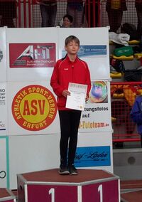 Olivia Prömel konnte sich in gleich drei Disziplinen deutlich steigern. Im 60m-Sprint der W12 verbesserte sie sich um vier Zehntel auf 9,29s. Im Weitsprung gelang ihr der erste 4-Meter-Sprung mit 4,08m. Sie wurde damit Fünfte. Im Kugelstoßen blieb sie mit 5,91 knapp hinter den sechs Metern. Aileen Forgber stieß ihre Kugel auf 6,03m. Charis Hoffmann startete nach der erfolgreichen Freiluftsaison auch in Erfurt wieder durch. Im 60m-Vorlauf der W14 kam sie mit neuer Bestleistung von 8,56s ins Ziel. Im Endlauf wurde sie aufgrund eines Fehlstarts disqualifiziert. Im Weitsprung gewann sie mit 4,78m. Genauso konnte Charis im Kugelstoßen mit 10,49m einen Sieg einfahren. Für Lea Raps war in der Altersklasse der 15-jährigen die Drei eine Glückszahl. In drei Disziplinen konnte mit drei Bestleistungen dreimal Dritte werden. (60m: 8,85s, Weit: 4,25m, Kugel: 7,78m)