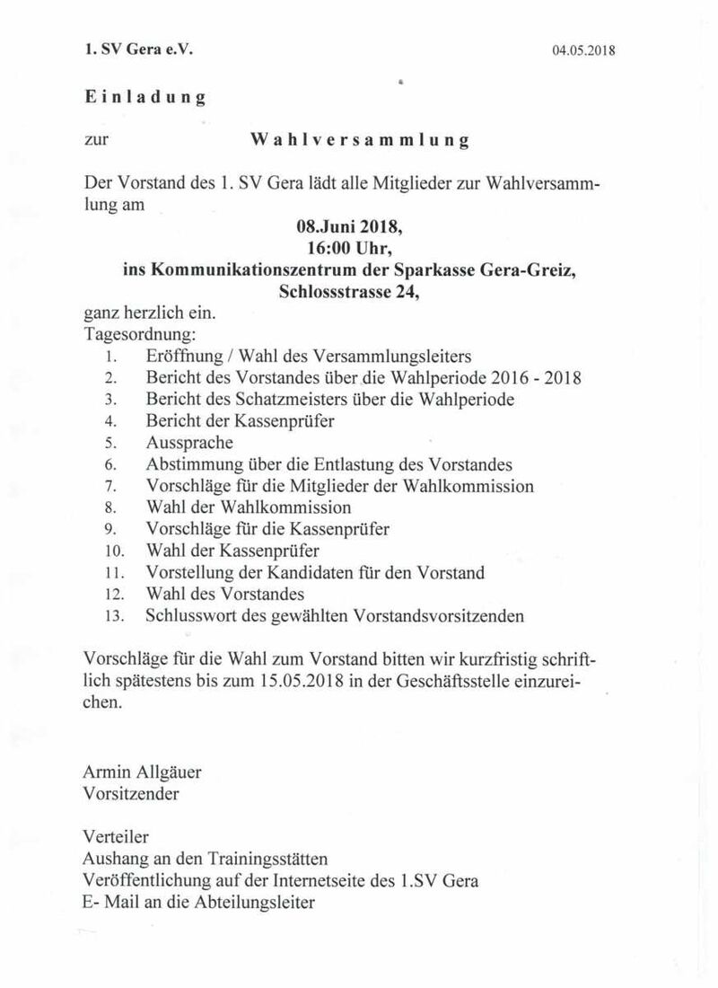 Der 1. SV Gera lädt alle Mitglieder zur Wahlversammlung ein. Diese findet am 8. Juni 2018 um 16:00 Uhr im Kommunikationszentrum der Sparkasse Gera-Greiz in der Schlossstraße 24 statt. Genauere Informationen können folgender Einladung entnommen werden.